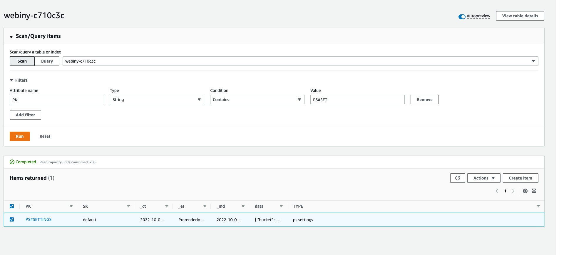 Finally, similarly to what we had in the API application section, a PS#SETTINGS Amazon DynamoDB entry will be created in the process. Meaning, in order to avoid the error we explained above, we’ll need to find the record via the DynamoDB console, and delete it: